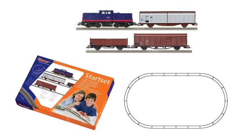 Аналоговый стартовый набор - тепловоз BR 745 401-7 и три товарных вагона. Тепловоз оборудован 8-ми пиновым разъёмом для подключения цифрового декодера, и светом в прожекторах, переключаемым в зависимости от направления движения. Также в комплект входит аналоговая система управления ROCO c двумя выходами питания - для подключения рельс (постоянный ток напряжением 0-14В) и для подключения дополнительных электрических аксессуаров (переменный ток 14В), блок питания ROCO 80107 (230В 50Гц.~18В, 36VA ), набор рельсового материала ROCO GEOLINE с балластом, для создания овала размером150 Х 90 см.