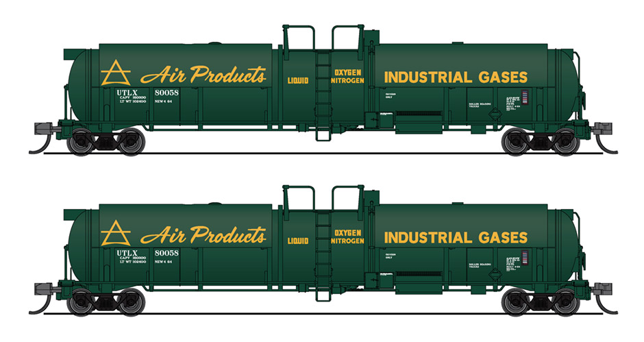 Набор из двух четырехосных железнодорожных цистерн повышенной емкости для транспортировки и хранения жидких криогенных продуктов: кислорода, азота или аргона. Принадлежность Air Products